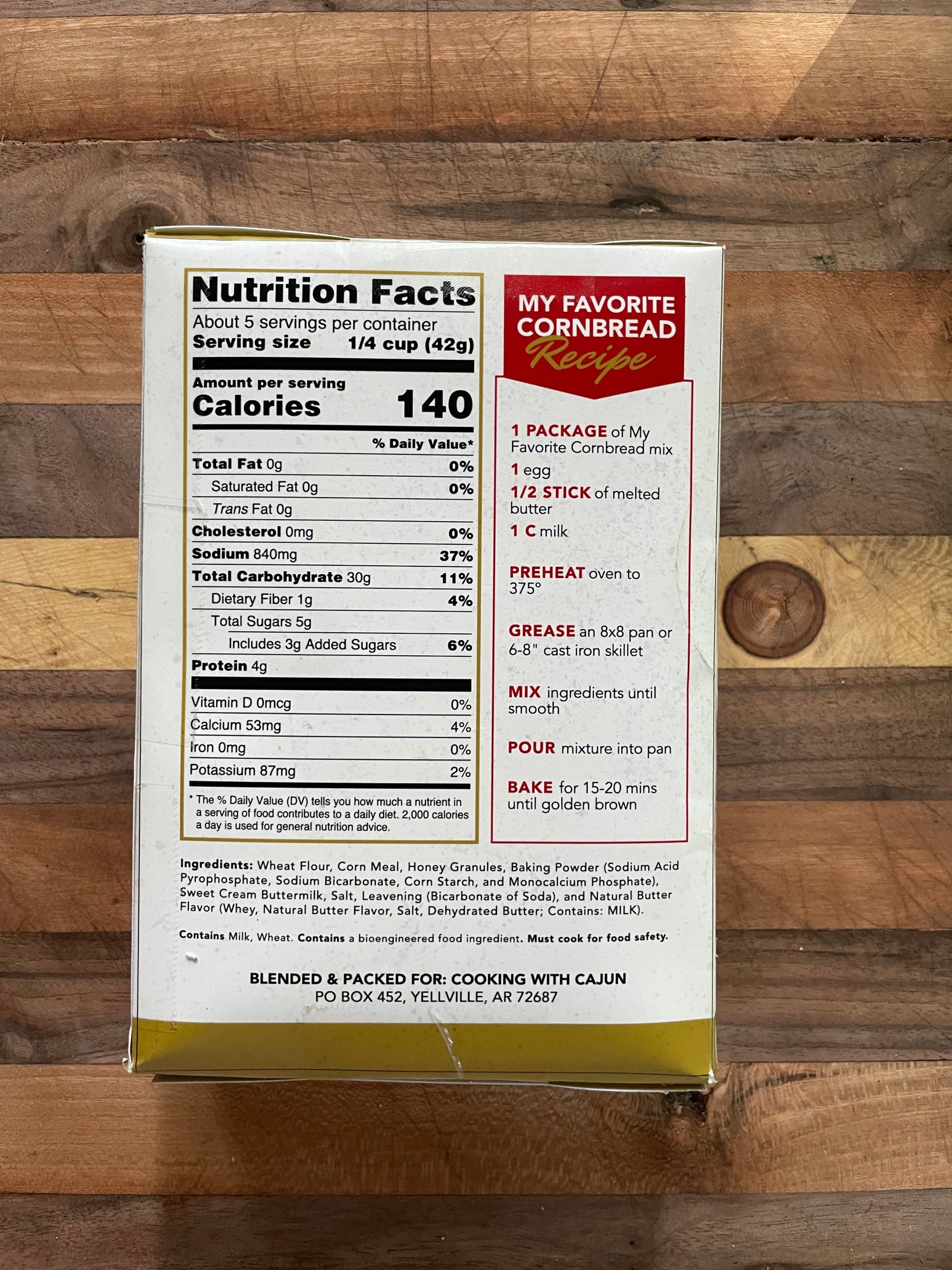 Golden, moist, and full of flavor, this cornbread is a true Cajun kitchen favorite. Made with simple, wholesome ingredients like stone-ground cornmeal, fresh eggs, butter, and a touch of sugar, it bakes up with a tender inside and a lightly crisp crust. Perfect on its own or paired with gumbo, beans, or a pot of smothered greens, this cornbread brings comfort and Southern tradition to every table. A classic recipe with just the right balance of sweet and savory—it’s the kind of cornbread you’ll want to make again and again. TWO BOXES COME IN AND ORDER!!!